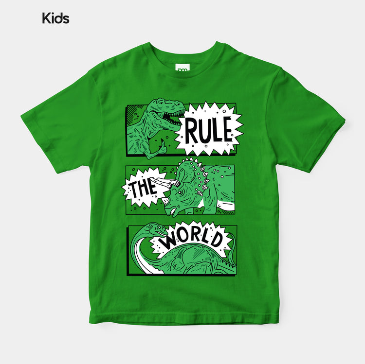 This kids’ graphic t-shirt features bold comic-style dinosaur artwork with the phrase “Rule the World”, perfect for boys and girls fascinated by prehistoric giants. With its fun, adventurous vibe, this tee is a hit for school, playdates, and casual outings.